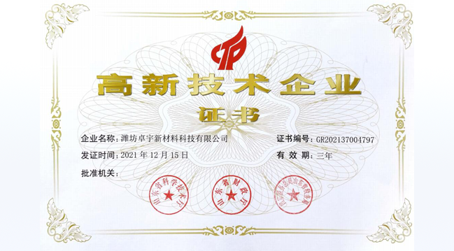 濰坊卓宇新材料科技有限公司重視產(chǎn)品質(zhì)量,不斷完善質(zhì)量檢測(cè)手段,保證產(chǎn)品質(zhì)量的穩(wěn)定提高。 我們始終堅(jiān)持“質(zhì)量?jī)?yōu)良,信譽(yù)誠(chéng)信”的至誠(chéng)至信經(jīng)營(yíng)方針......